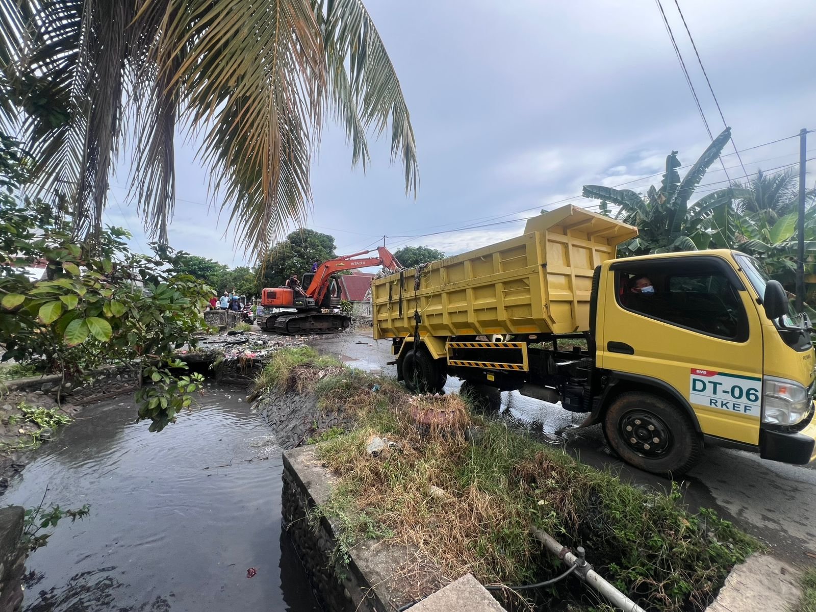 Proses pembersihan berlangsung efektif setelah sebuah excavator milik warga setempat, Risma, dikerahkan untuk mengangkat sampah dan material yang menutup saluran air. Alat berat tersebut digunakan untuk mengeruk tumpukan sampah yang sulit dibersihkan secara manual dan telah lama menyebabkan aliran air tersendat.