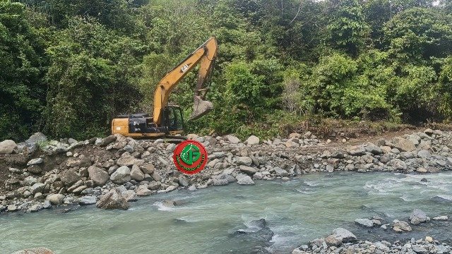 Pantauan di lokasi, alat berat milik PT BMS tengah bekerja menumpuk batu-batu besar untuk memperkuat bantaran dan mengalihkan tekanan arus sungai.